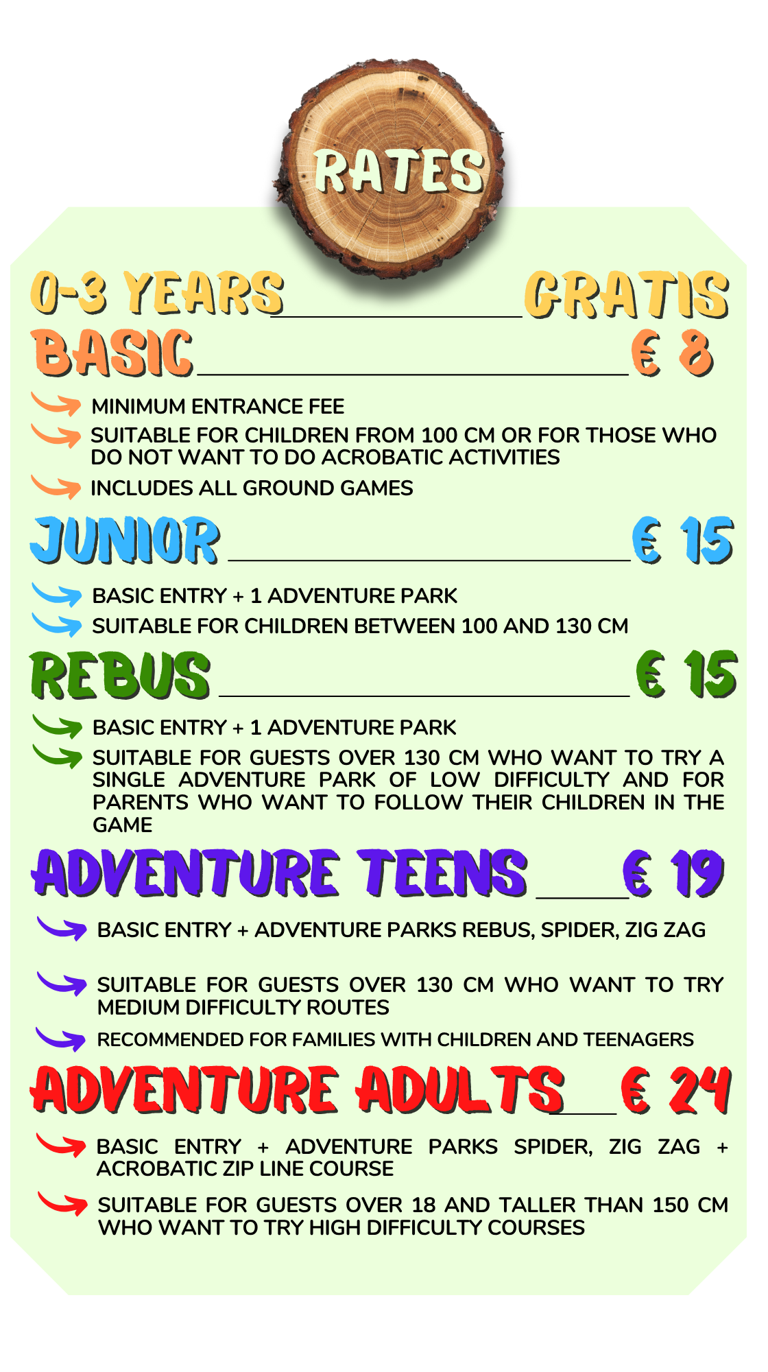 During the day it is possible to integrate the various adventure parks to the “basic” ticket. The integration (of variable cost) must be booked at the info point. THE AVAILABILITY OF INSERTION IN THE BRIEFINGS DEPENDS ON THE DAILY INFLOW.